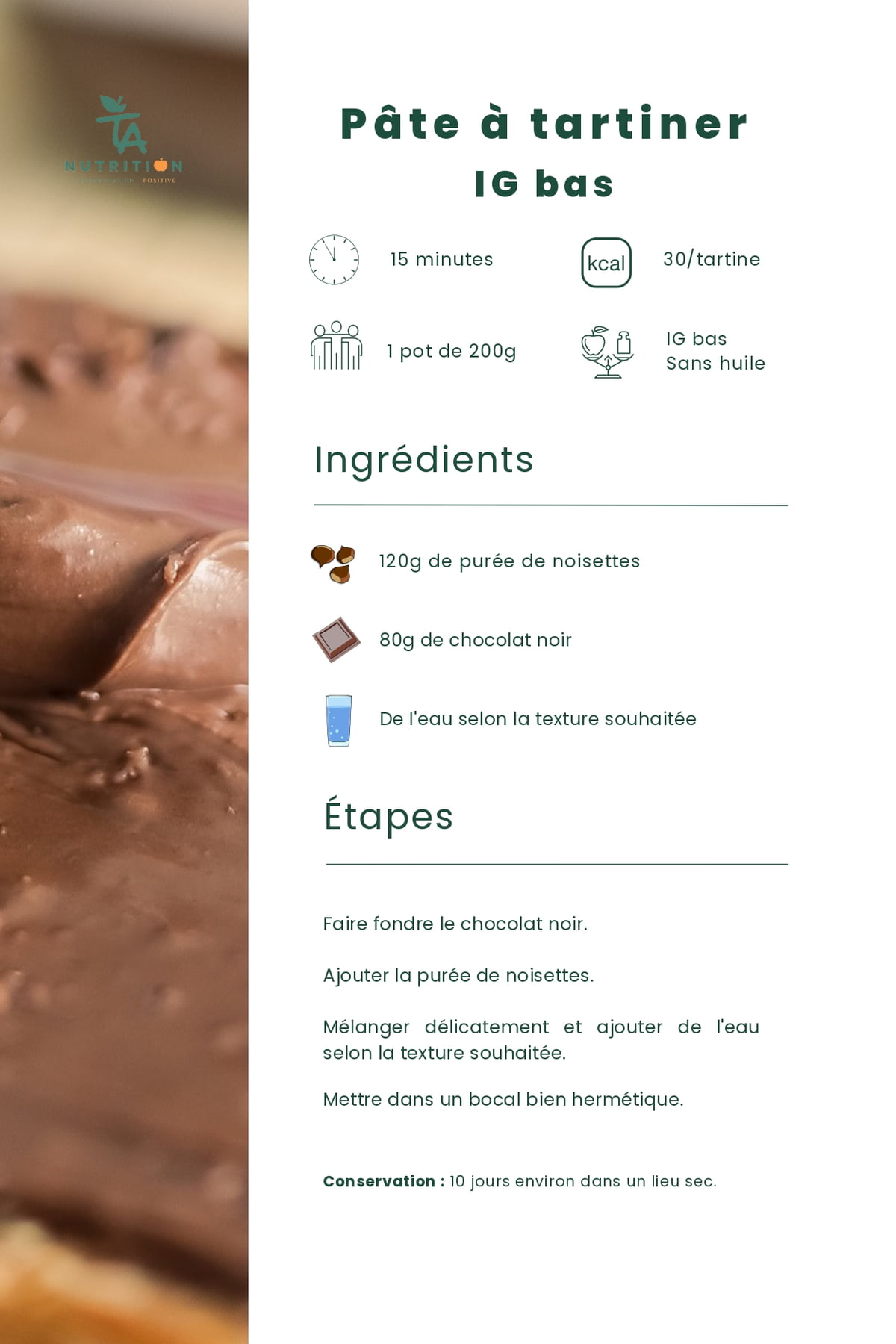 Pâte à tartiner très peu sucrée, vegan, sans lactose, sans gluten.